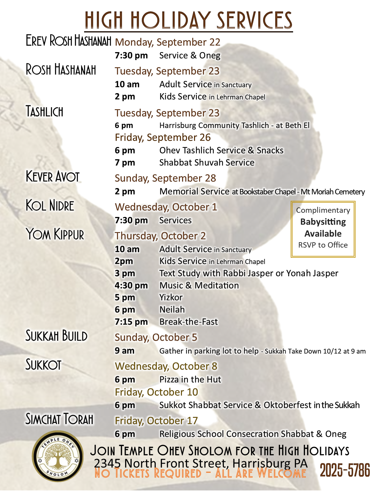 Join us for High Holidays 2025, in person in the sanctuary and online via our Youtube channel. All are welcome. No tickets or passwords required. Email [email protected] if you have any questions.